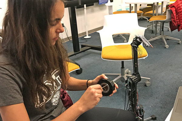Inside NYIT-Long Island's Innovation Lab ("iLab"), which is located near the entrance of the Wisser Library, the mechanical engineering student is applying a protective casing to a "Dexter" reconfigurable robot, a mechanical creation she can build using 3-D-printed parts.